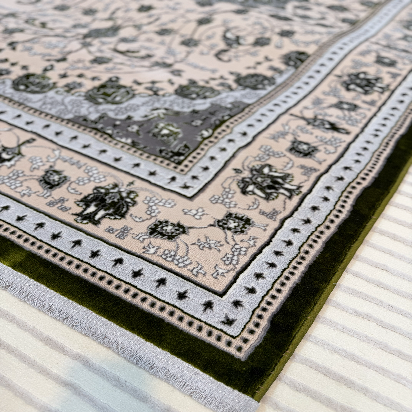 سجادة من جودة أطلس بتصميم أنيق ومتين، مصنوعة في تركيا بلون أخضر وأوف وايت، مع تفاوت قياسي بسيط في المقاسات ناتج عن طبيعة الخامات وطبقة الظهر.