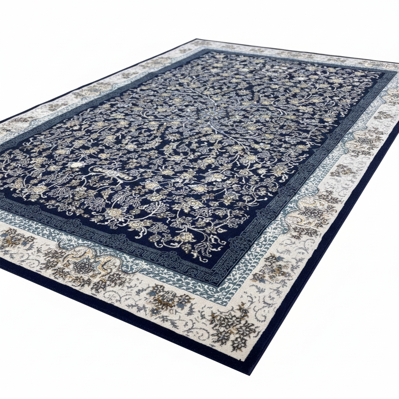 اسم المنتج والمقاس: سجادة مصنوعة من القطن، اللون كحلي، مع تحمل فرق قياسي بنسبة 2% – 3% بسبب القطن والطبقة الخلفية.