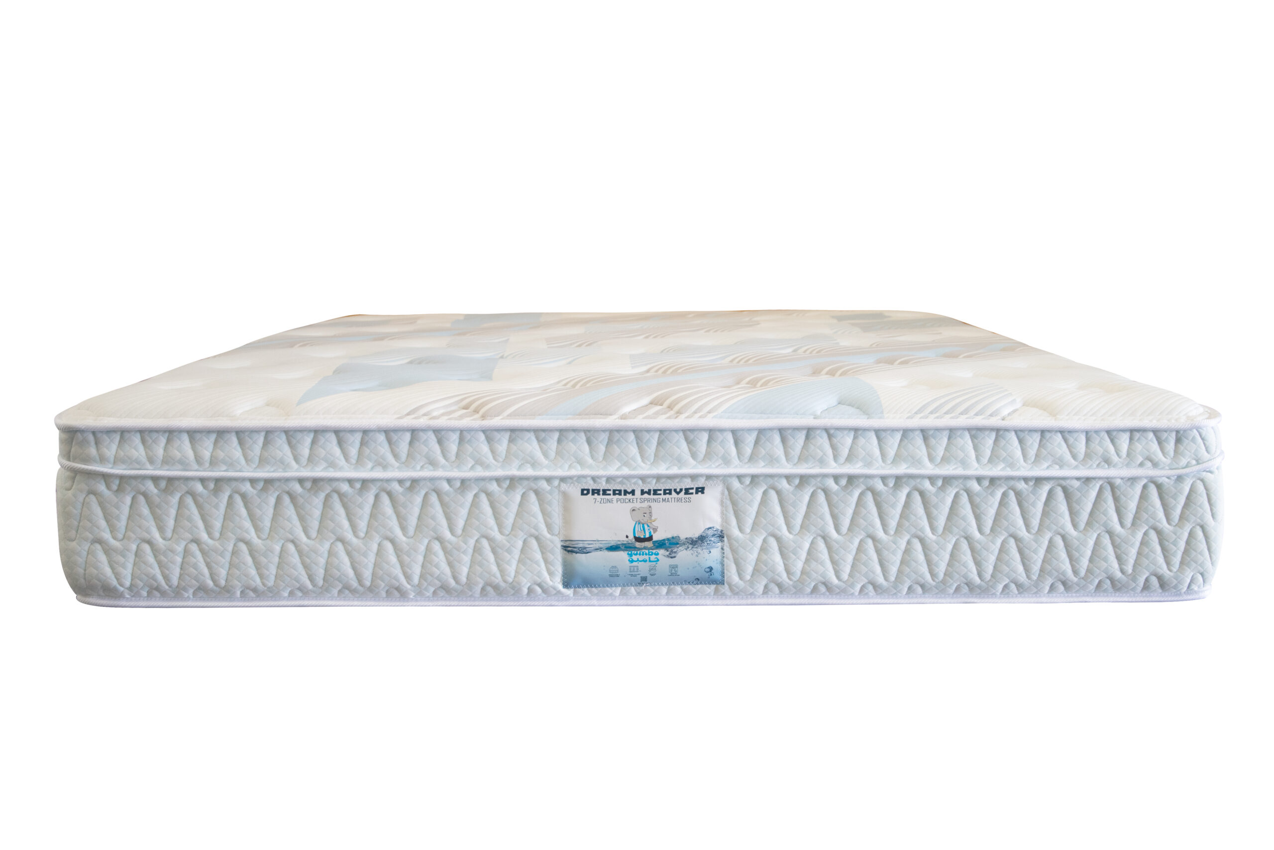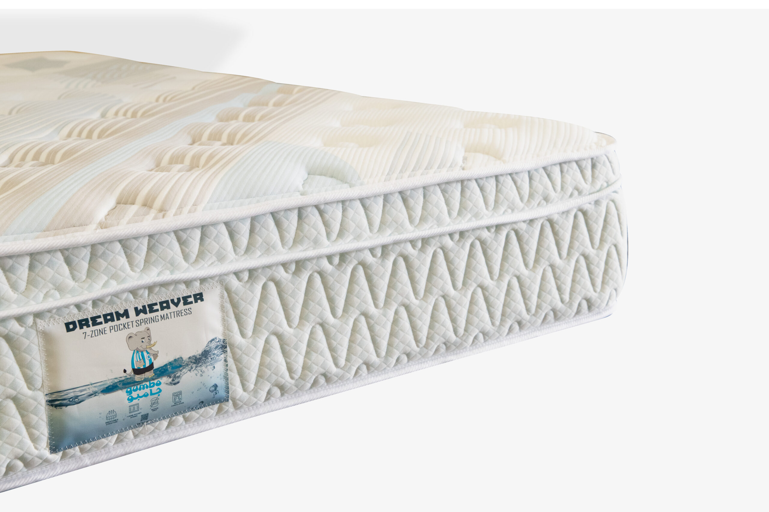 The mattress is built with an independent Pocket Spring system featuring Seven Zones technology, where the springs are divided into seven different support areas (head, shoulders, back, hips, thighs, legs, and feet).